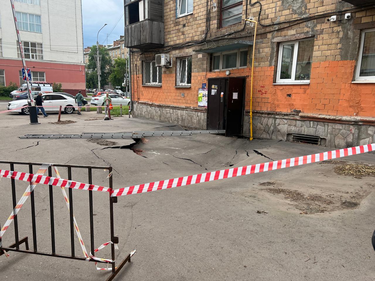 Утром 2 июля в оперативные службы поступило сообщение о просадке грунта возле первого подъезда пятиэтажного жилого дома по адресу улица Бограда,114.