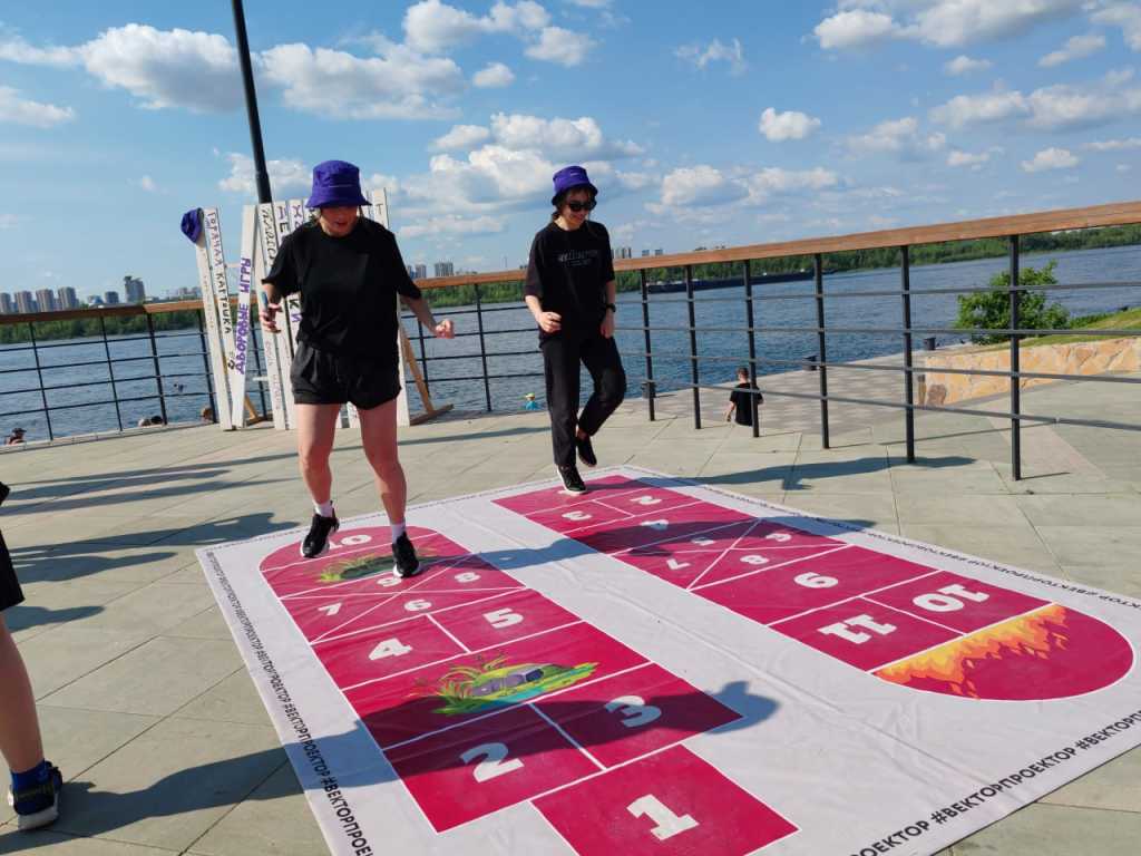 Для маленьких гостей организовали специальную зону с интерактивными развлечениями. Внутри неё можно было попрыгать в классики всей семьёй, проверить себя на меткость и побросать кольца, поводить хороводы, сыграть в настольные и напольные игры, а также принять участие в познавательных квизах.