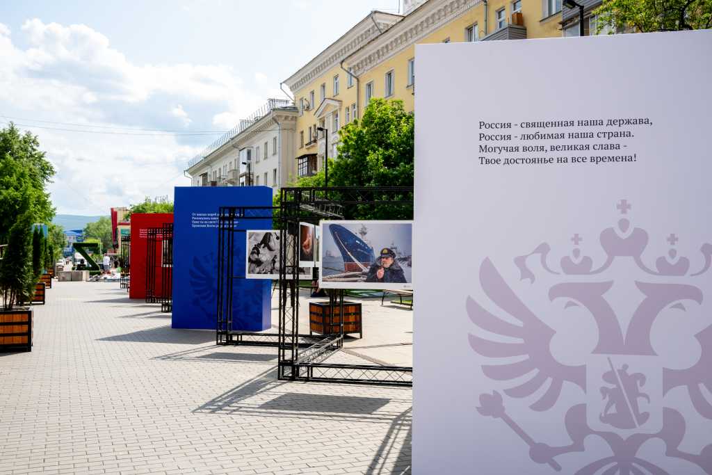 Руководитель агентства печати и массовых коммуникаций края Ирина Брежнева на открытии выставки рассказала: «Это уже ставшая традиционной ежегодная выставка. Экспозиция состоит из трёх частей: историческая часть, наша природа и, самая главная – это люди. Каждая часть украшена своим цветом. В целом получается цвета флага Российской Федерации. Кроме того, конструкции украшают слова гимна нашей страны. Мы видим, что выставка пользуется популярностью у красноярцев».