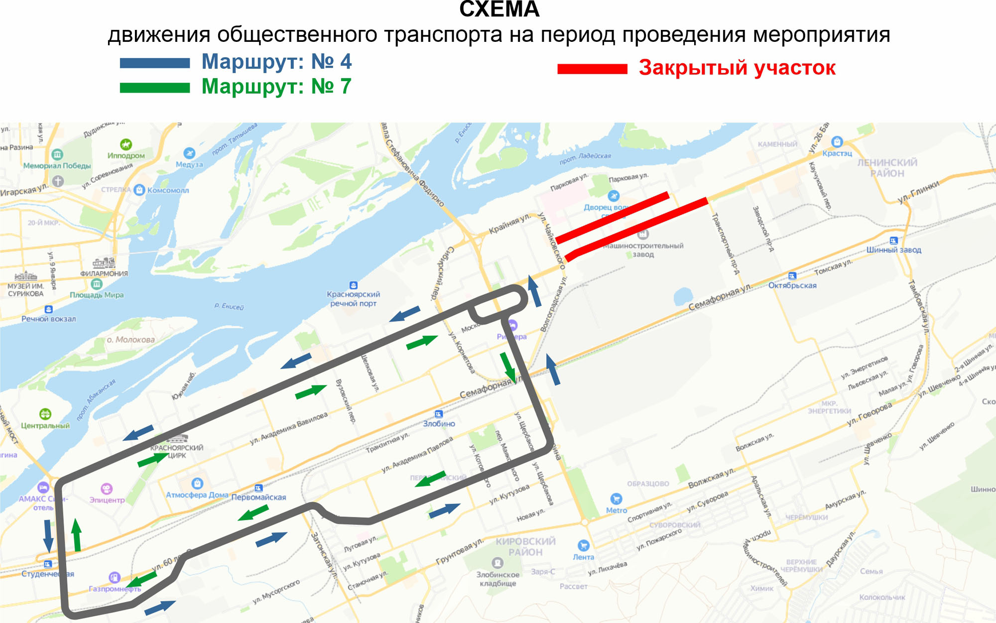 В это же время трамваи маршрута № 7 будут покидать проспект имени газеты «Красноярский рабочий» и через переулок Короткий направляться по улицам Московской, Мичурина, Щорса, 60 лет Октября до конечной остановки «Трамвайное депо».