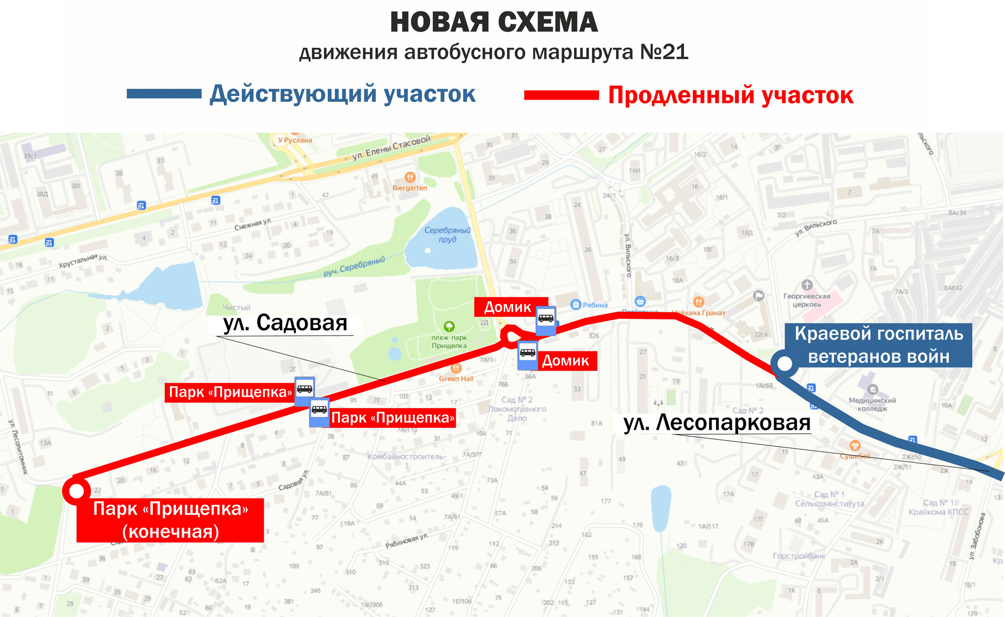 Принято решение продлить автобусный маршрут №21 «Спортзал – Краевой госпиталь ветеранов войн». На маршруте добавятся остановки «Домик» и «Парк «Прищепка». Разворачиваться автобусы будут в районе улицы Еловая.