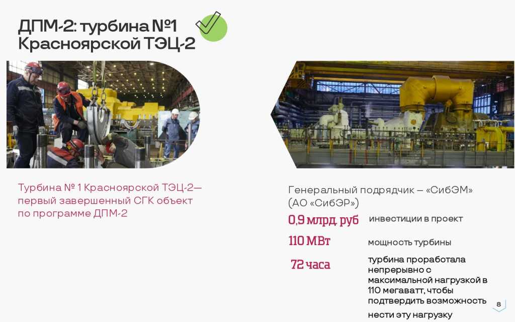 Турбина №1 Красноярской ТЭЦ-2 — это первый полностью завершённый СГК объект по программе ДПМ-2. Мы согласовали у системного оператора отчет об успешном выполнении всех программ испытания, турбина уже в работе.